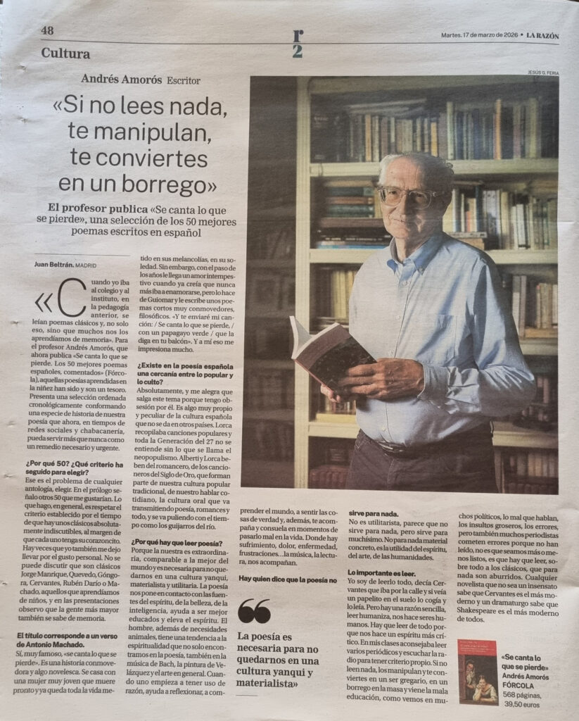 “Cuando yo iba al colegio y al instituto, en la pedagogía anterior, se leían poemas clásicos y, no solo eso, sino que muchos nos los aprendíamos de memoria”. Para el profesor Andrés Amorós, que ahora publica “Se canta lo que se pierde”. Los 50 mejores poemas españoles, comentados (Fórcola), aquellas poesías aprendidas en la niñez han sido y son un tesoro que guardó dentro y siempre lo ha acompañado. “Nos han enseñado a vivir y en los momentos difíciles nos han dado consuelo”. Amorós presenta una selección ordenada cronológicamente que va del Arcipreste de Hita a Antonio Carvajal, pasando por todos nuestros clásicos, conformando, casi sin pretenderlo, una especie de historia de nuestra poesía, que quizá ahora, en tiempos de redes sociales, superficialidad y chabacanería pueda servir, más que nunca, como un remedio necesario y urgente.