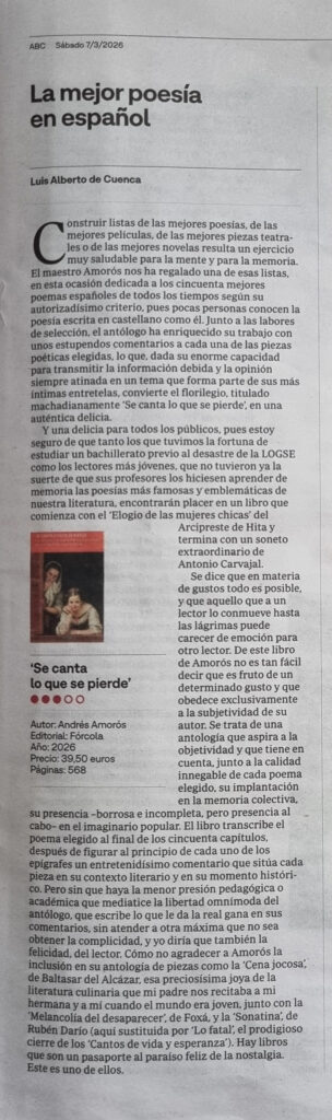 Y una delicia para todos los públicos, pues estoy seguro de que tanto los que tuvimos la fortuna de estudiar un bachillerato previo al desastre de la LOGSE como los lectores más jóvenes, que no tuvieron ya la suerte de que sus profesores los hiciesen aprender de memoria las poesías más famosas y emblemáticas de nuestra literatura, encontrarán placer en un libro que comienza con el «Elogio de las mujeres chicas» del Arcipreste de Hita y termina con un soneto extraordinario de Antonio Carvajal.