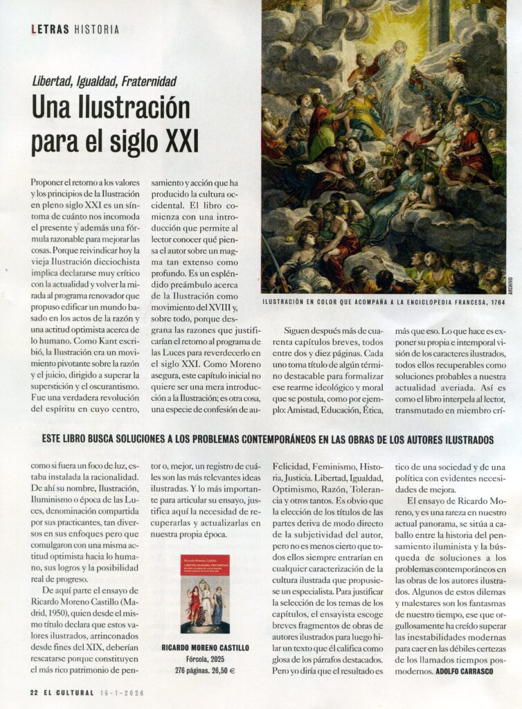 El ensayo de Ricardo Moreno, Libertad, igualdad, fraternidad, es una rareza en nuestro actual panorama, se sitúa a caballo entre la historia del pensamiento iluminista y la búsqueda de soluciones a los problemas contemporáneos en las obras de los autores ilustrados. Algunos de estos dilemas y malestares son los fantasmas de nuestro tiempo, ese que orgullosamente ha creído superar las inestabilidades modernas para caer en las débiles certezas de los llamados tiempos modernos.